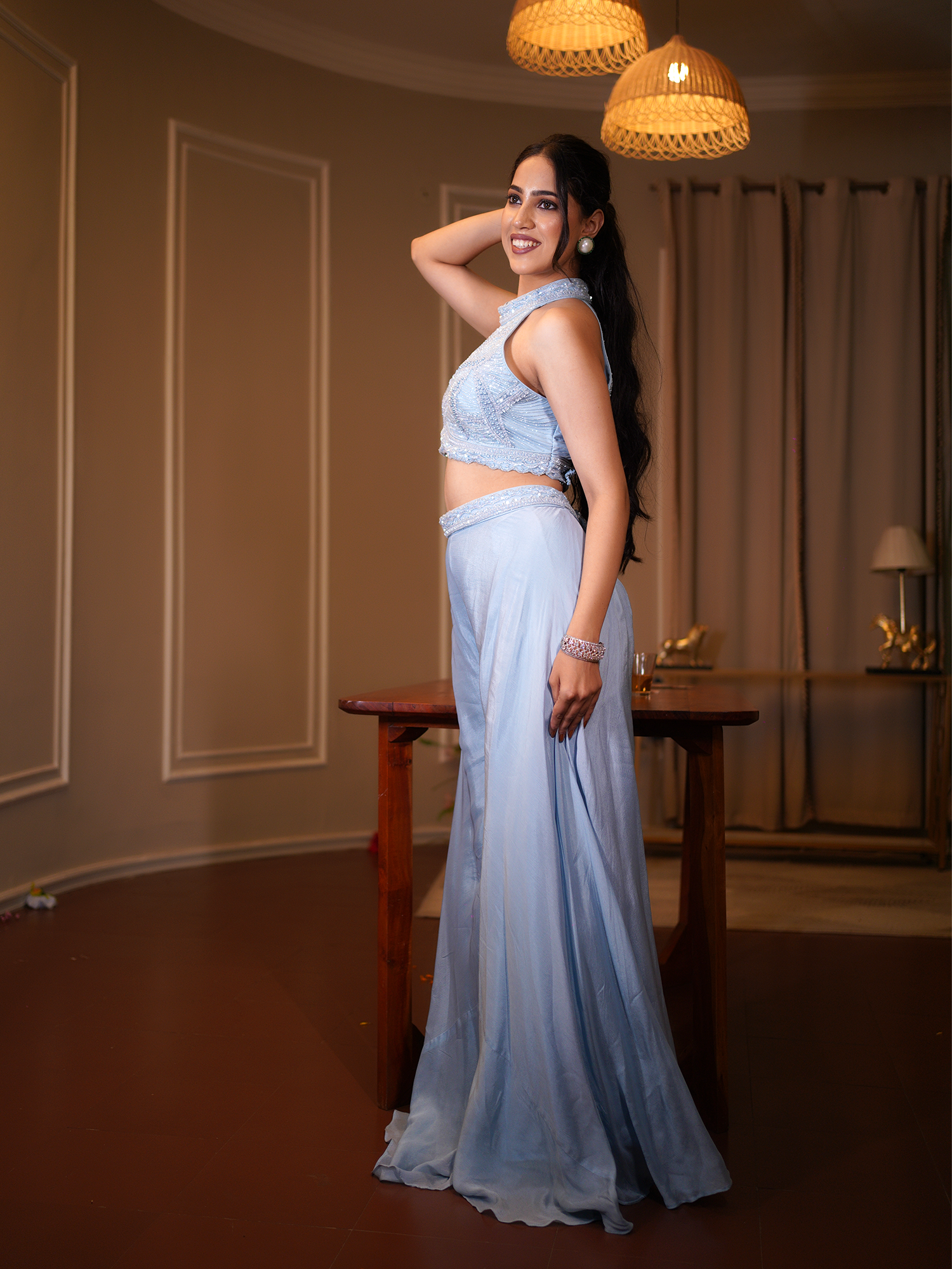 Soft, modern, and effortlessly chic — Azure Bloom captures contemporary elegance in a serene pastel blue palette. The halter-style blouse is intricately hand-embroidered with pearls, sequins, and tonal beadwork, creating a subtle shimmer that complements the fluid drape of the wide-leg pants.