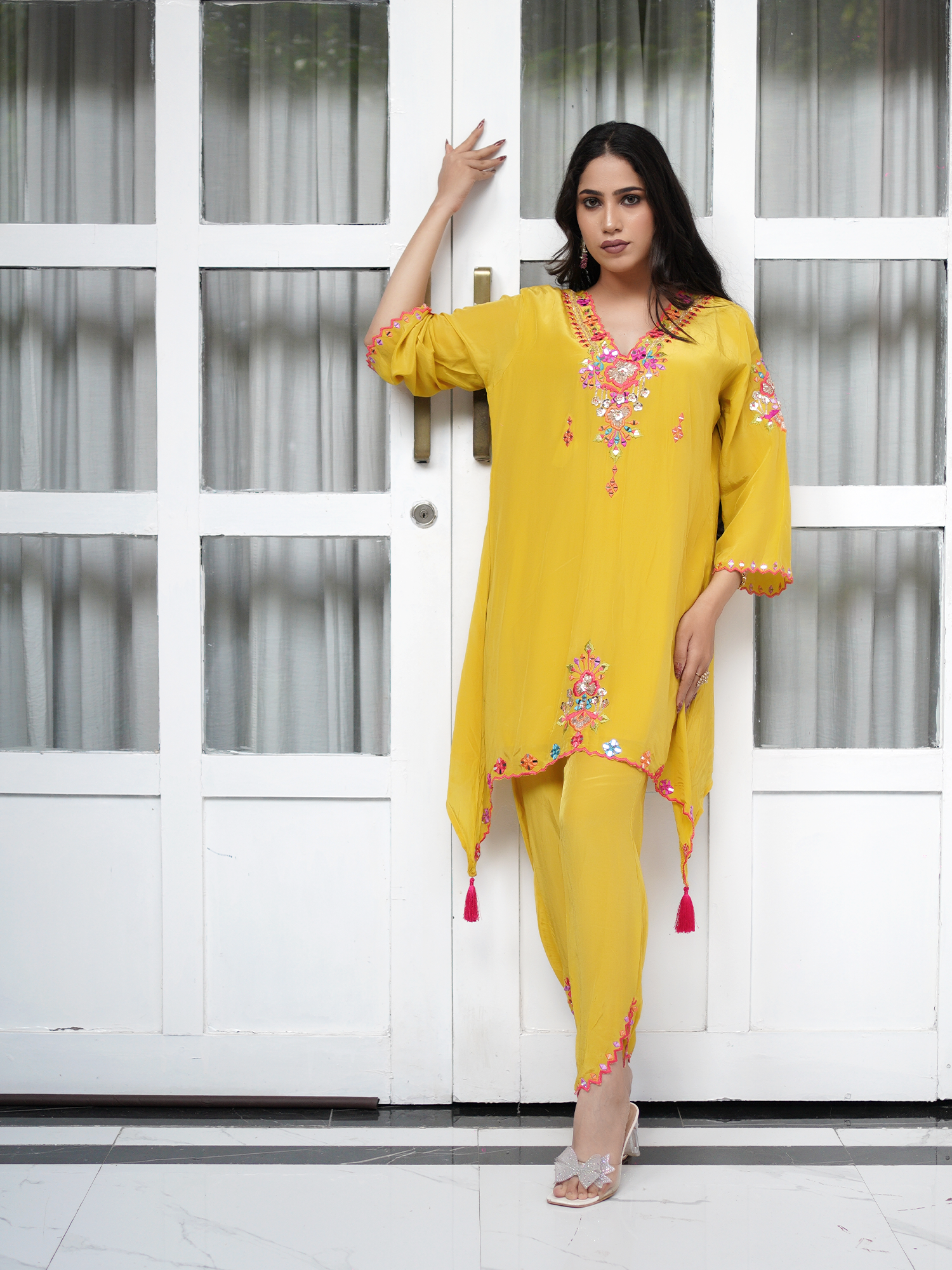 Bright, breezy, and beautifully detailed — the Marigold Muse Kurta Set captures the joy of festive dressing with effortless charm. The mustard-hued kurta is adorned with intricate multicolored floral embroidery and mirror work, paired with matching pants that feature scalloped and tassel accents. The asymmetrical hemline adds a modern edge, making it perfect for daytime celebrations, pujas, or festive get-togethers.