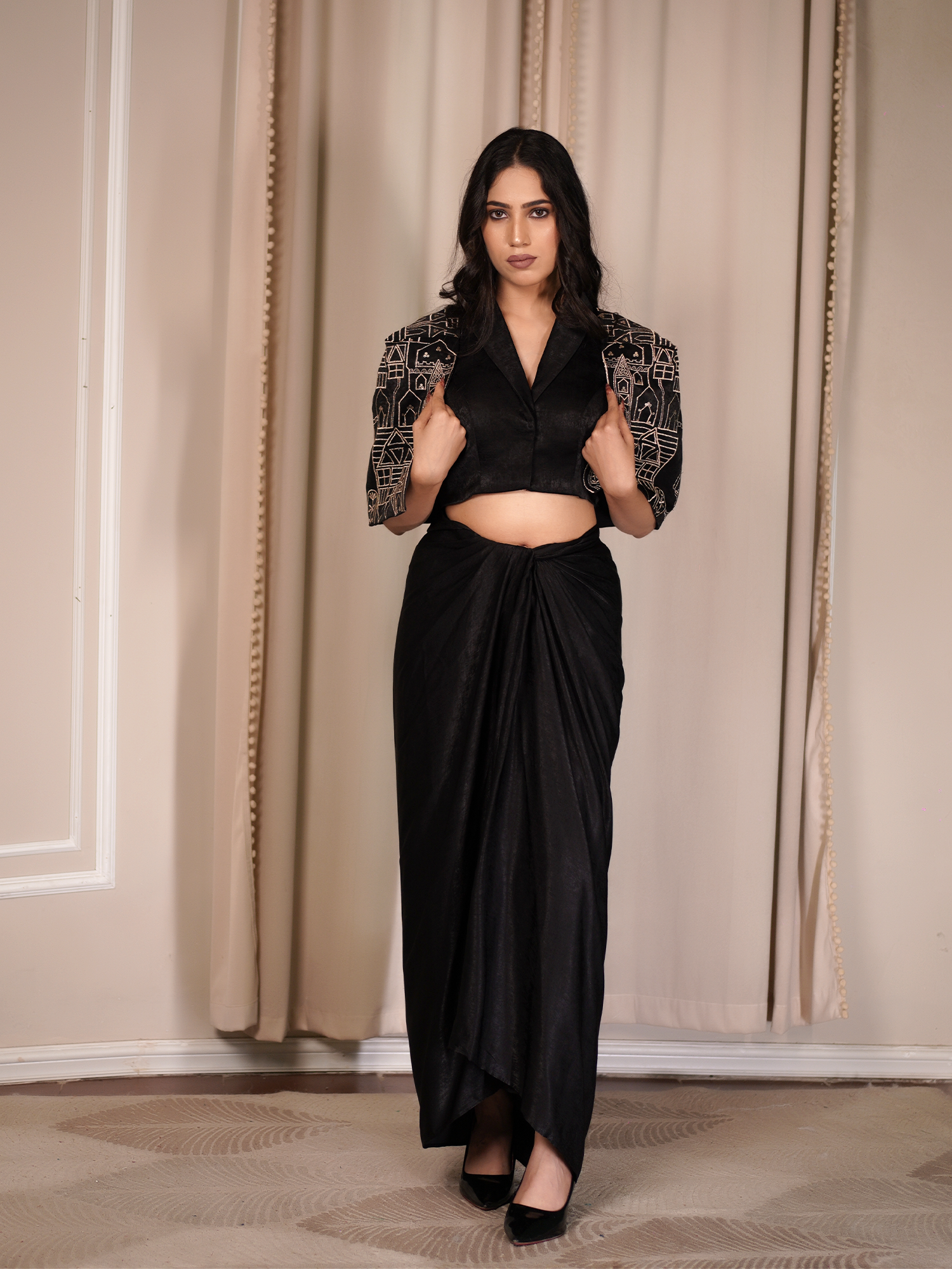 The Midnight Grace Drape Set is where modern allure meets timeless poise. Crafted in lustrous black satin, the ensemble features a sleek collared blouse and a fluid draped skirt that beautifully accentuates the silhouette. The highlight — an intricately embroidered jacket with geometric metallic motifs — adds structure and statement to the look. Perfect for cocktail evenings, festive galas, or contemporary celebrations where elegance speaks louder than words.