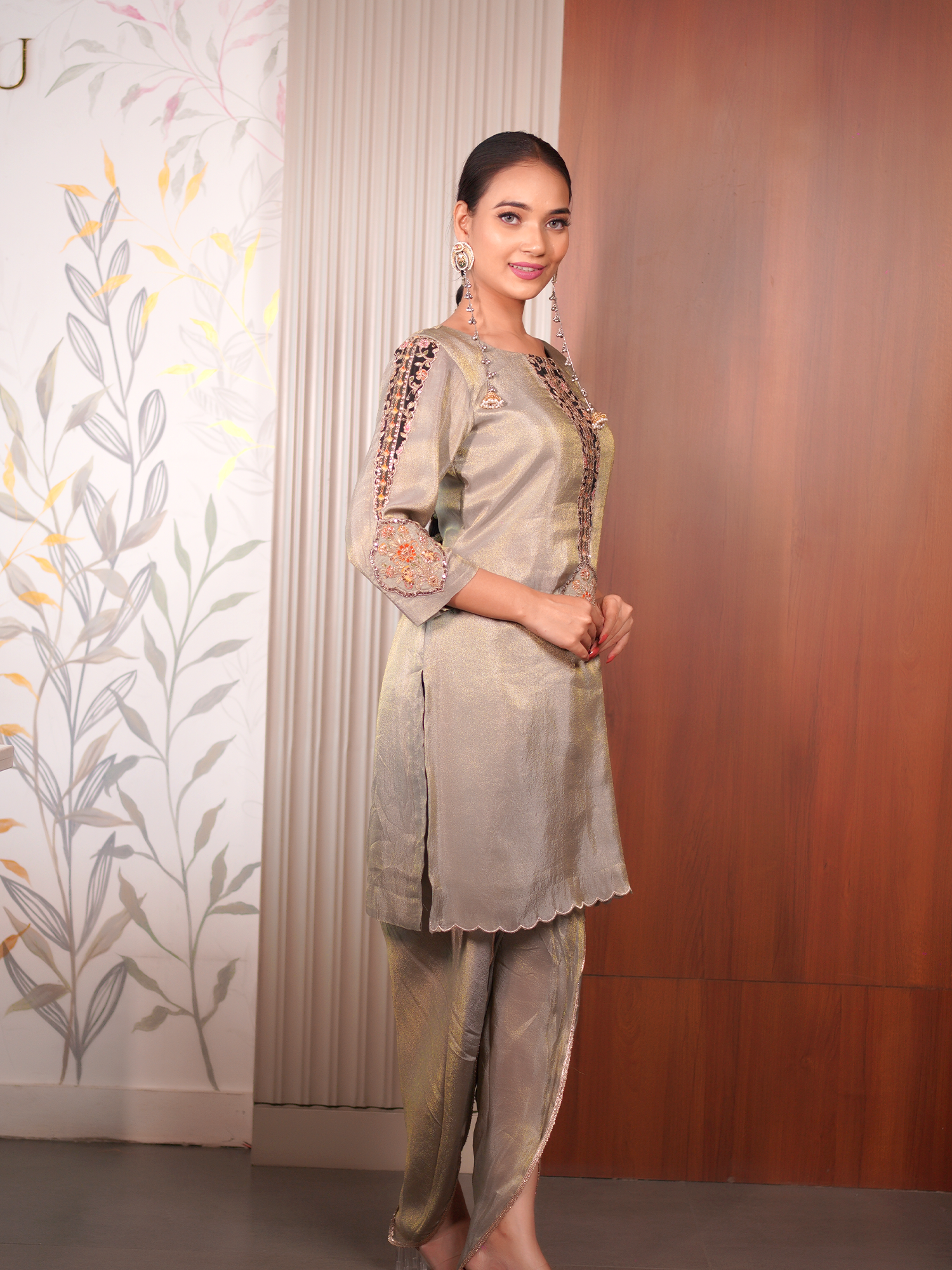 The Moonlit Grace Set embodies understated glamour with its sleek silhouette and delicate embroidery. Crafted from a luxurious shimmer silk blend, the outfit features scalloped edges and intricate detailing along the neckline and sleeves — a perfect blend of contemporary style and timeless elegance.
