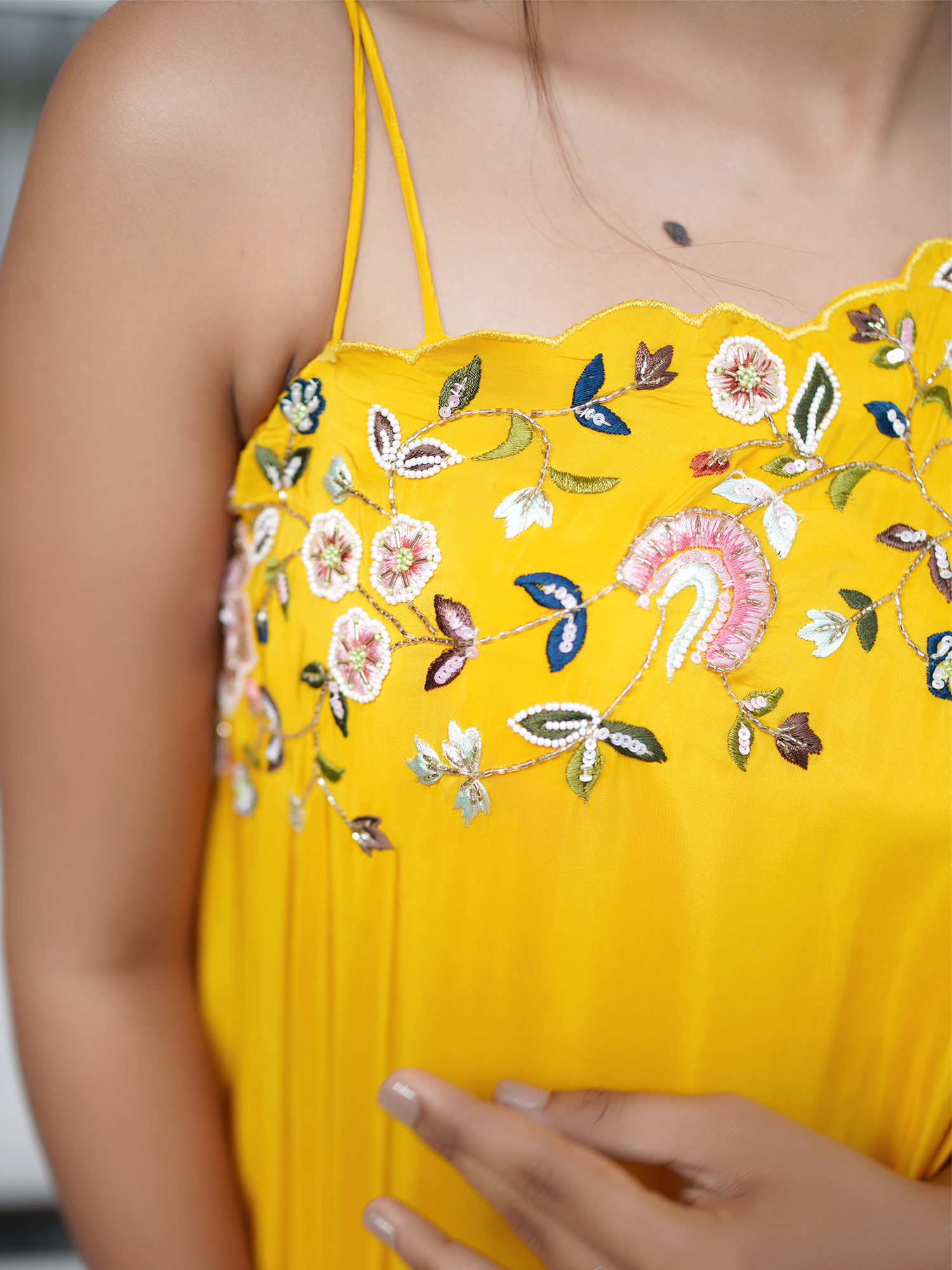 Radiate sunshine and sophistication in our Sunehri Charm Drape Set. Designed in a vibrant marigold yellow, this asymmetrical one-shoulder drape features intricate floral embroidery and playful fringe detailing. The flowy silhouette blends festive elegance with modern comfort, making it the perfect pick for haldi functions, mehendi celebrations, or daytime soirées.
